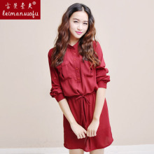 2014春装新款娃娃领欧美宽松收腰裙长袖雪纺连衣裙酒红
