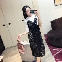 柔柔家2017夏季新款 韩版两件套女裙子T恤吊带裙中长款蕾丝连衣裙