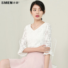 诗萌2017春装新款蕾丝打底衫v领荷叶袖镂空上衣修身小衫女7105170