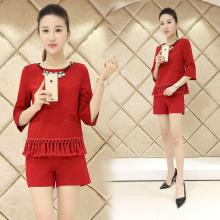 2017新款欧洲站两件套休闲时尚红色短裤套装女秋名媛小香风套装潮