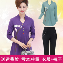 中老年妈妈春秋装时尚长袖T恤中年妇女新款上衣打底衫两件套