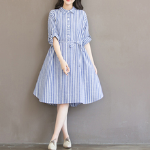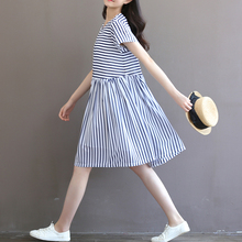 【天天特价】孕妇夏装短袖棉麻中长款文艺宽松显瘦衬衫条纹连衣裙