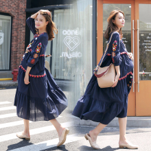 时尚连衣裙孕妇裙中长款辣妈气质高端刺绣长裙孕妇装春装2017潮妈