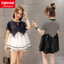 孕妇夏装套装时尚款2017新款韩版条纹A字上衣托腹短裤两件套潮妈