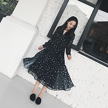 TAKIYA 定制2017春新款波点雪纺连衣裙女黑色高腰修身显瘦A字长裙