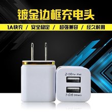 智能手机平板通用2.1A+1A双USB电镀边充电头金边银边1A充电器批发