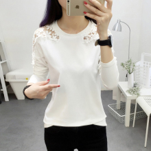 长袖t恤女外穿秋衣宽松钩花蕾丝打底衫女长袖秋冬加厚纯色上衣