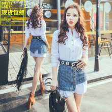 枪枪家2017春装新韩版显瘦白衬衫高腰牛仔半身裙女时尚套装两件套