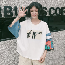 夏装韩国原宿宽松卡通牛仔拼接bf风短袖T恤女ulzzang半袖学生上衣