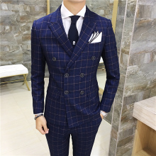 韩版修身休闲双排扣格子西服套装结婚礼服商务休闲西装
