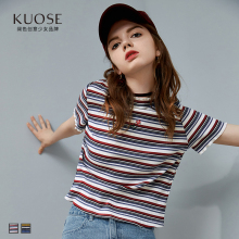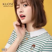 阔色2017夏装新款日系女装原创学生翻领条纹百搭上衣短袖T恤预售