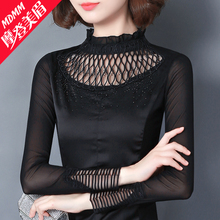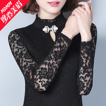 蕾丝衫女2017秋冬装新款百搭立领长袖加绒加厚打底衫修身网纱上衣