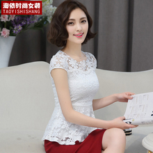 2017夏装新款圆领短袖蕾丝衫女小衫韩版时尚镂空修身显瘦打底衫潮