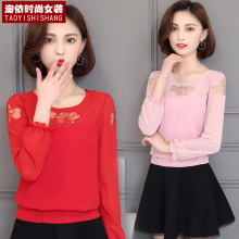 2017春装新款女装韩版长袖圆领大码雪纺衫修身蕾丝打底衫纱衣小衫