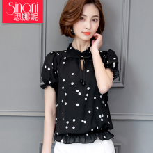 雪纺衫女春夏短袖2017新款时尚波点蝴蝶结衬衣韩版宽松大码上衣服