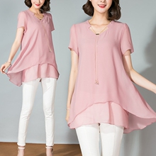 2017夏装新款韩版女装中长款气质雪纺衫v领短袖宽松显瘦雪纺上衣