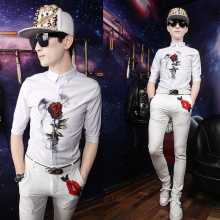 16新款夏季男中袖衬衫韩版修身个性玫瑰花五分袖衬衣男小伙夜店男