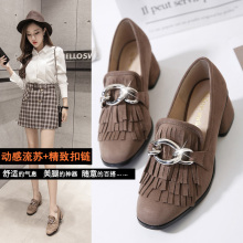 韩版百搭方头粗跟加绒单鞋女中跟秋冬英伦流苏高跟鞋皮带扣深口鞋