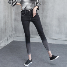 2017春季韩版弹力渐变色小脚九分牛仔裤女高腰显瘦毛边黑色铅笔裤