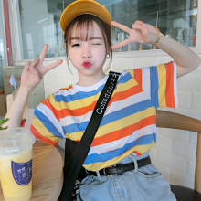 2017春装新款宽松显瘦纯棉彩虹色条纹短袖T恤女学生打底衫韩版潮