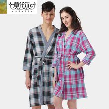 男士睡袍夏季薄款 情侣睡袍女纯棉格子浴衣浴袍睡袍男夏季 浴袍男