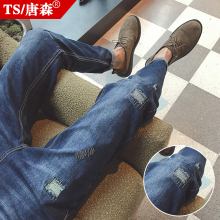 唐森2017男士牛仔裤男韩版百搭潮流破洞男青年修身小脚九分牛仔裤