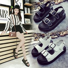 2017夏季新款皮带扣平跟一字扣带露趾鱼嘴罗马鞋学生平底凉鞋女鞋