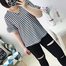 【天天特价】胖mm2017夏装新款加肥大码女装短袖t恤女棉条纹宽松