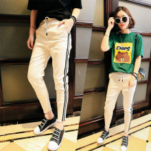 白色休闲裤女长裤春装新款韩版时尚条纹拼接破洞显瘦阔腿小脚裤潮