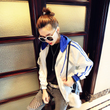 短外套女长袖2017春装新款女装BF风连帽条纹撞色显瘦防晒上衣帽衫