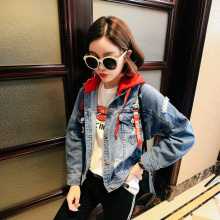 包邮连帽牛仔衣女春装新款韩版时尚百搭破洞长袖拼色显瘦短外套潮