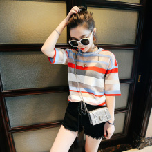 t恤女短袖夏季新款韩版时尚修身百搭彩色条纹镂空透视显瘦上衣潮