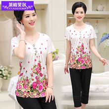 妈妈装夏装套装中年女装短袖t恤40-50岁大码中老年人上衣裤子印花
