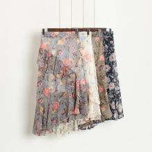 2017春夏新款碎花荷叶边雪纺半身裙女不规则沙滩度假高腰中长裙女