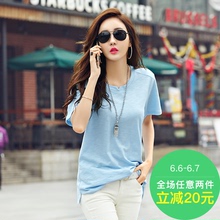 2017夏装宽松t恤女短袖纯棉大码竹节棉女士前短后长上衣休闲体恤