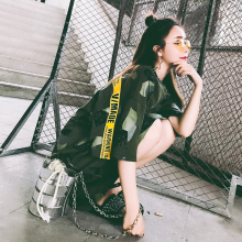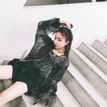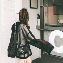 ISSDM 透视网纱连帽镂空罩衫女春季长袖黑色宽松显瘦中长款防晒衣