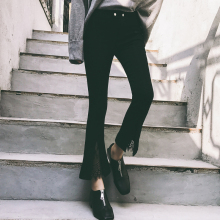 ISSCC春季新款蕾丝拼接修身黑色喇叭裤女高腰九分裤显瘦休闲裤子