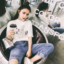 ISSDM 夏季新款字母刺绣玫瑰印花短袖t恤女宽松夏季镂空挂脖上衣