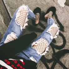 ISSDM 春装新款做旧毛边破洞牛仔裤女宽松九分裤显瘦乞丐裤送网袜