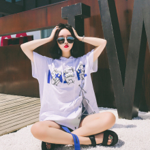 ISSDM 白色T恤女中袖学生春夏女装宽松显瘦印花破洞中长款上衣潮