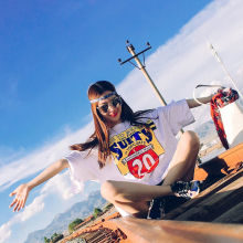 ISSDM 夏季侧开叉绑带人物印花短袖连帽卫衣女薄款宽松显瘦t恤裙