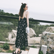 后背交叉羽毛V领吊带裙荷叶边碎花雪纺连衣裙女夏显瘦长裙鱼尾裙
