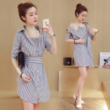 2017夏季新款韩版条纹衬衫小清新连衣裙女修身假两件套装a字裙子