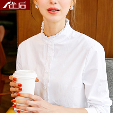 2017春装新品衬衣蕾丝花边淑女拼接百搭长袖白色立领修身衬衫女
