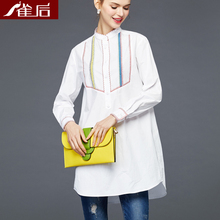 雀后2017春秋新款衬衣长袖纯色刺绣立领百搭中长款衬衫上衣女