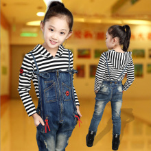 潮妞依族童装女童中大童2016新款韩版春秋宝宝牛仔背带裤儿童套装