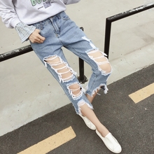 2016秋季韩版新款破洞牛仔裤女薄款显瘦做旧乞丐九分裤女休闲裤子