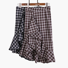 不规则格子半身裙春2017新款清新百搭棉麻中长裙荷叶边气质鱼尾裙