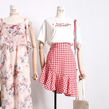 2017夏季露肩短袖字母刺绣T恤套装+荷叶边不规则格子半身裙两件套