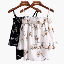韩范chic风百搭甜美大花朵印花一字领露肩喇叭袖吊带雪纺衬衫学生